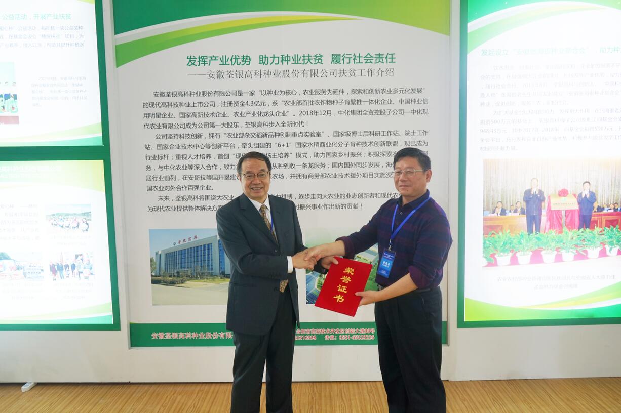 ??? 10月17日是第六個全國扶貧日,民政部社會組織管理局在安徽合肥舉行全國性糧農類社會組織產業扶貧對接活動暨第十七屆中國國際糧油產品及設備技術展示交易會。民政部黨組成員、副部長詹成付,安徽省人民政府常務副省長鄧向陽,國家糧食和物資儲備局副局長韓衛江等領導出席開幕式。在中國種子協會的支持與推薦下,荃銀高科參與本次全國性糧農類社會組織產業扶貧對接活動并獲頒證書。